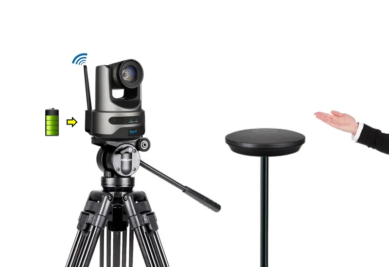 Live Streaming Kamera CR60W wireless mit KI Tracking Funktion integrierte Lithium Batterie mit wireless Betrieb bis 6 Stunden, optional Batteriesystem anschliessbar.